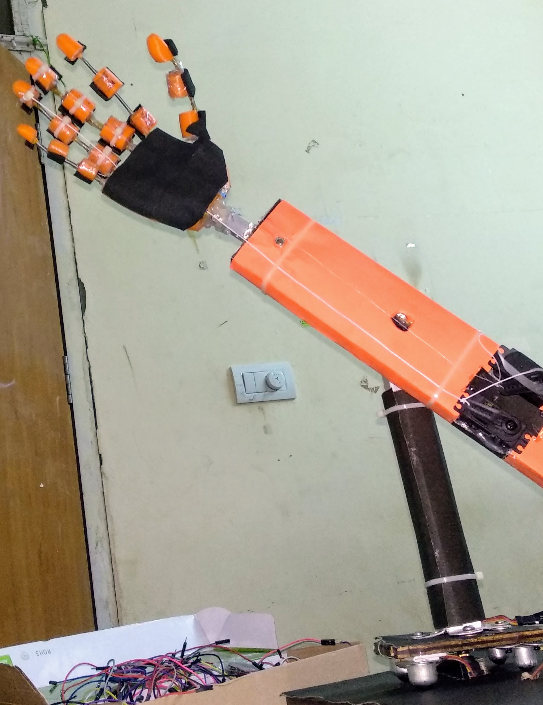 It was built using 3D printed parts and controlled by Servo motors. It was able to pick a tennis ball.